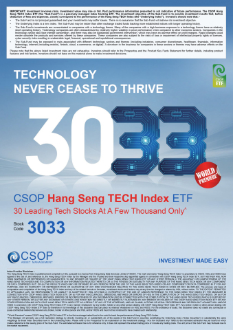 香港--(美国商业资讯)--南方东英资产管理有限公司(“南方东英”)自豪地宣布南方东英恒生科技指数ETF(股票代码:3033.HK)将在香港证券交易所上市。南方东英恒生科技指数ETF追踪新近推出的恒生科技指数,让全球投资者能够抓住快速增长的科技板块和在越来越多在香港上市的科技公司带来的投资机会。南方东英恒生科技指数ETF(3033.HK)的上市起始价格约为7.5港元,每手交易为200股,管理费为0.99%,将于2020年8月28日开始交易。自成立以来,3033.HK已获得两千四百万美元的初始投资。