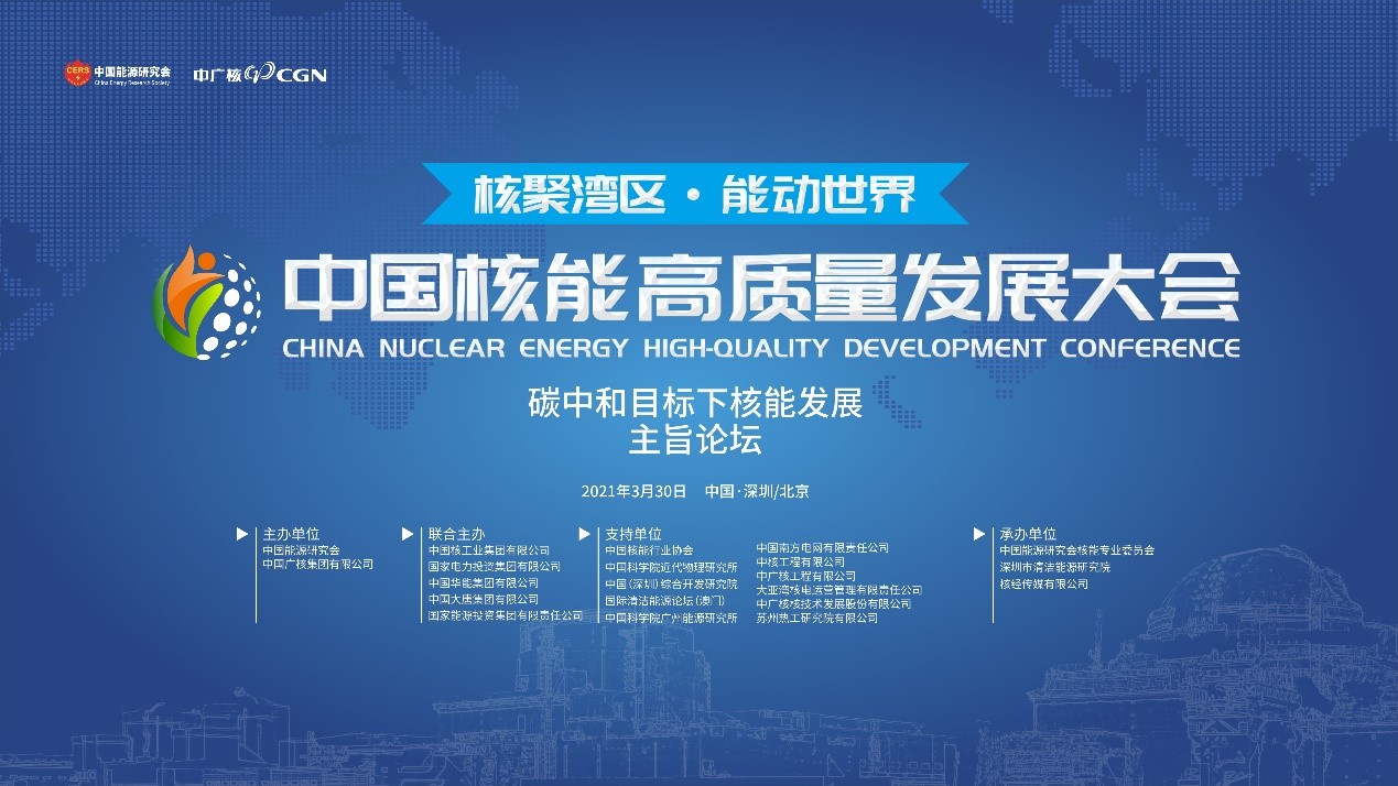 2021年3月30日,由中国能源研究会、中国广核集团主办,中国核工业集团、国家电力投资集团、中国华能集团、中国大唐集团、国家能源集团等联合主办的首届中国核能高质量发展大会主旨论坛在深圳、北京两地联动举办,有来自国家政府部门、各核电集团、科研院所等领导、专家及装备与服务企业、社团组织、金融、媒体机构等各方代表等400余人现场参会。论坛同步在央视频、新华网、中国网、搜狐网等24家视频平台进行直播,同时在线观看高达15万人,播放总量突破110万余人次。