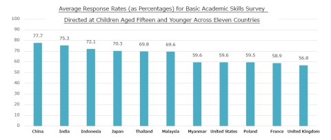 在SPRIX针对11个不同国家15岁或以下儿童开展的基本学业技能调查中,欧洲和美国的应答率较低。相反,亚洲国家的应答率平均为70%或更高。我们发现在基本学业技能、学习一致性和保持率方面存在地区差异。