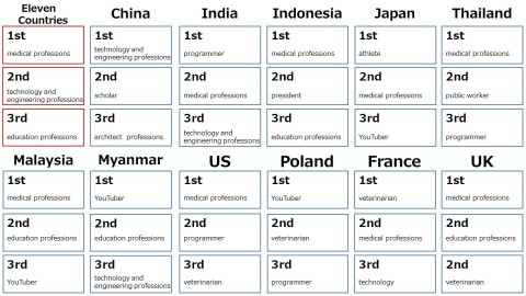 对儿童未来设想的调查发现,在大多数国家,选择未来从事医疗、技术、工程和教育职业的儿童学习成绩普遍较高。这11个国家的受访者在选择未来职业方面没有重大差异。随着技术创新增加了IT和数字技术在各行业服务角色中的作用,我们认为儿童对技术、工程和编程专业会越来越感兴趣。