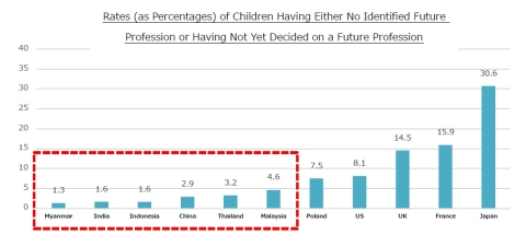 然而,我们确实看到儿童在对未来职业的明确设想方面存在地区差异。除日本以外,与欧洲和美国的儿童相比,其他亚洲国家的儿童对未来职业的设想要清晰得多。鉴于这些调查结果与保持基本学业技能国家的结果分布非常接近,我们认为这些调查结果是相关的。