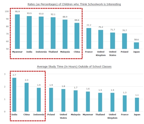 此外,在调查结果显示儿童有明确未来职业设想的国家,儿童也对他们在学校的课程表现出积极的感觉。此外,校外学习兴趣的趋势线也很高。调查清楚地表明儿童有很高的学习积极性。