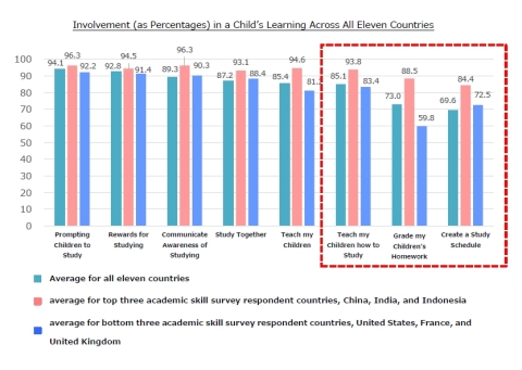 当我们针对家长或监护人参与孩子学习的意识进行调查时,所有11个国家的家长和监护人都极力参与,包括鼓励孩子学习和奖励孩子学习的参与率平均超过90%。然而,当涉及到家长或监护人教自己的孩子、给孩子批改家庭作业或为孩子制定学习计划时,我们确实看到了亚洲、欧洲和美国的地区差异。学业技能调查应答率较高国家的家长和监护人更积极地参与孩子学习的细节,包括独立制定孩子的学习时间表和给孩子批改家庭作业,而不是留给孩子来做。