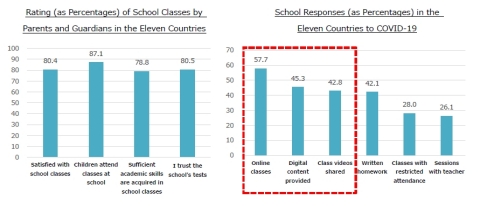 我们调查了家长和监护人如何支持学校,使其成为孩子学业技能教育的中心。所有11个国家的受访者都对学校给予了很高的评价,他们的回答包括对学校提供的课程、孩子上课以及在学校课堂上传授足够的学业技能感到满意。鉴于所有11个国家中约80%的受访者表示他们信任学校的测试结果,我们认为这表明他们对学校教育的满意度很高。相反,许多学校被迫重新考虑上课形式,以此作为对抗新冠疫情传播的手段,并实施了一些在线学习策略,包括通过远程会议应用(如Zoom)开设在线课程,提供数字内容,以及分享教师制作的课堂视频等。