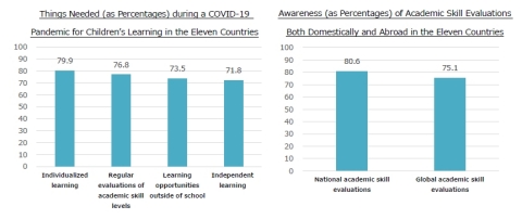 新冠肺炎疫情期间11个国家儿童学习需要的东西(以百分比表示);11个国家的国内外学业技能评估认知度(以百分比表示)(图示:美国商业资讯)